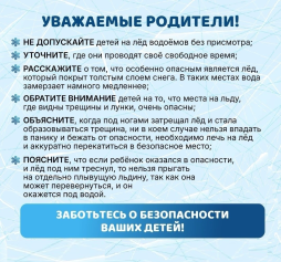 С целью предупреждения травмирования и гибели несовершеннолетних, обращаем Ваше внимание о НЕДОПУСТИМОСТИ нахождения несовершеннолетних лиц вблизи водоемов с неокрепшим льдом, выхода на лед, катания на санках, коньках, ледянках вблизи автодорог...